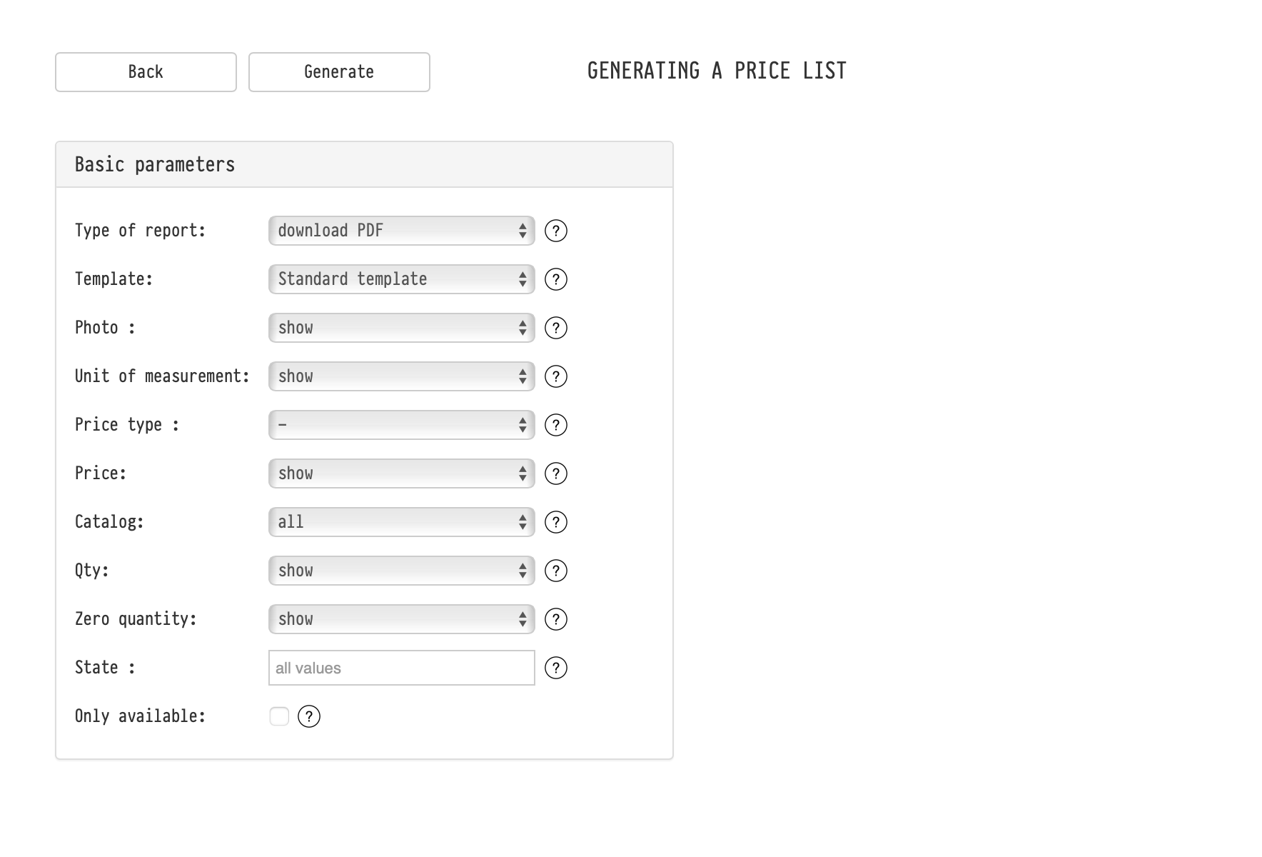 The system allows you to generate a price list based on the catalog with flexible display settings.