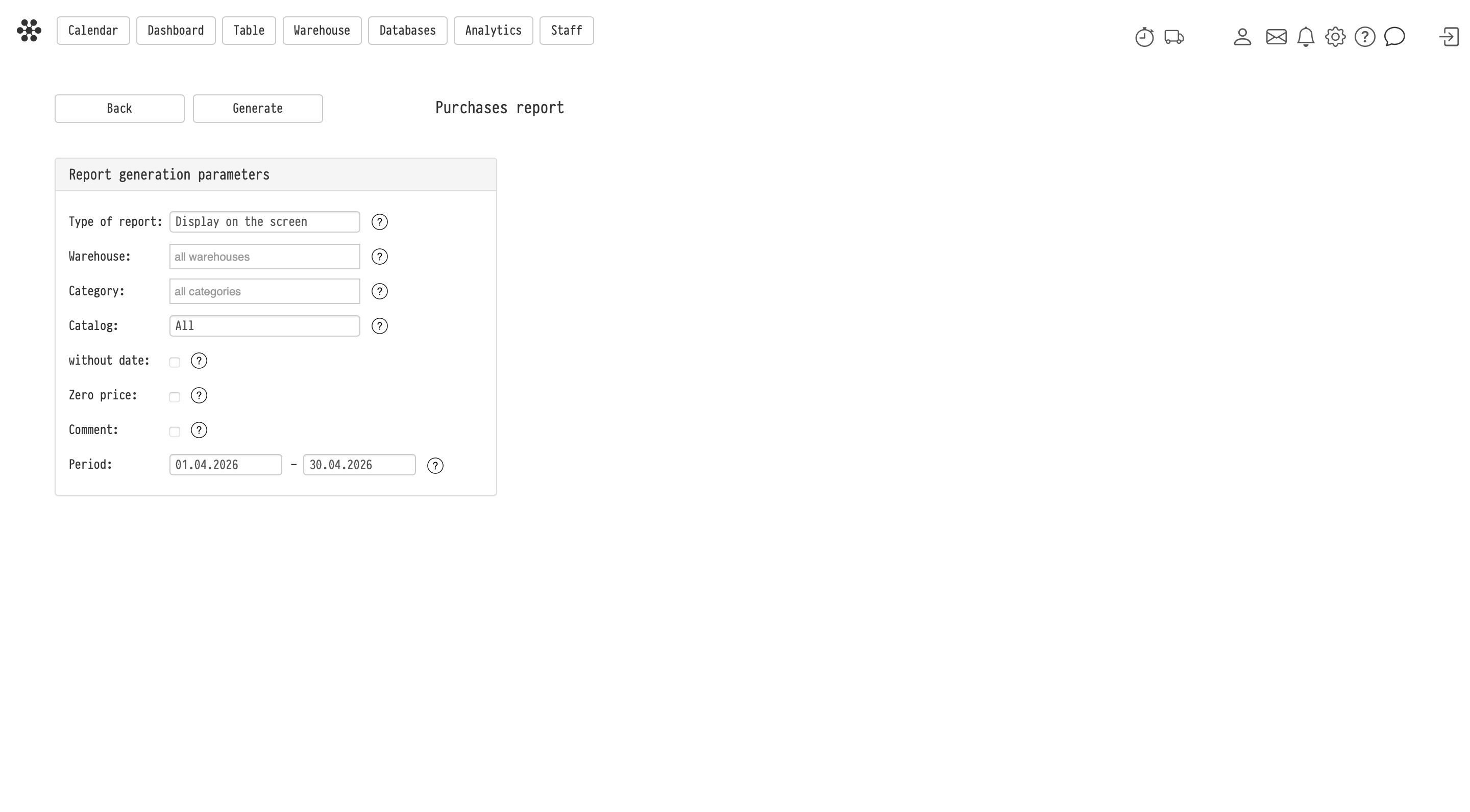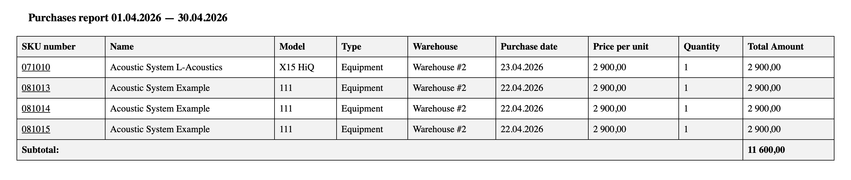 The Purchases report allows you to analyze all purchase operations for equipment, components, and consumables in the system.