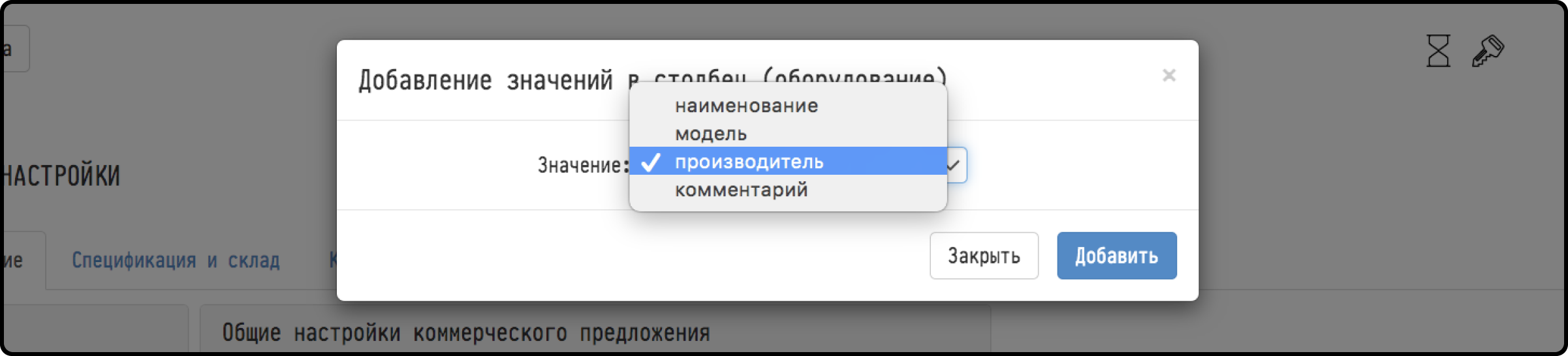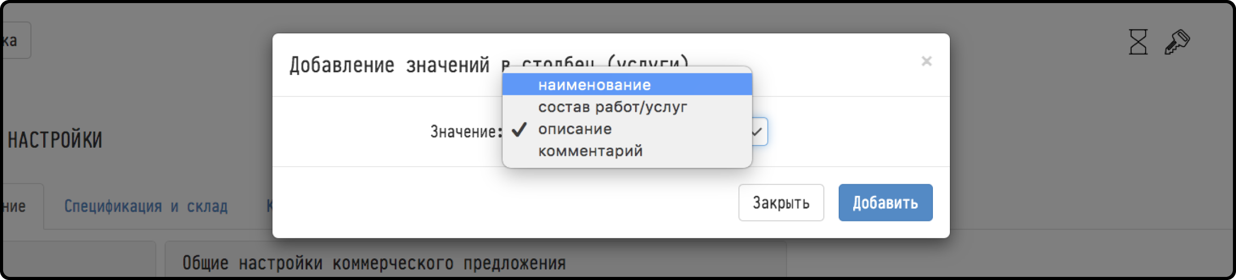 2) In the window that appears, enter the name of the column to be created (for example: "Equipment name", "Service", etc.). Note that under this name the column will be visible to the client in the commercial offer. We save what we wrote by clicking on the "Add" button;