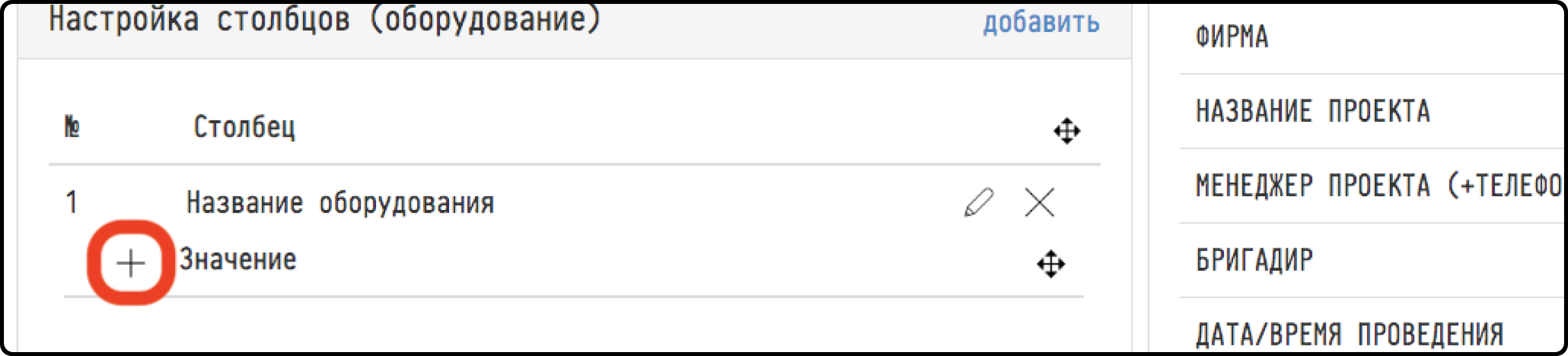 4) If we need two or more values characterizing the equipment or service to be shown in the same column at the same time (for example, the name of the device, its manufacturer, and model are all in one field of the table), then we need to click "plus" again to the right of the word "value", and in the window that appears select the next required value.